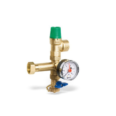 Solar safety unit for connection to solar control unit, pressure gauge 0 – 10 bar, solar combined feed cock and drain valve, solar relief valve 6 bar. Different response pressure available on request.